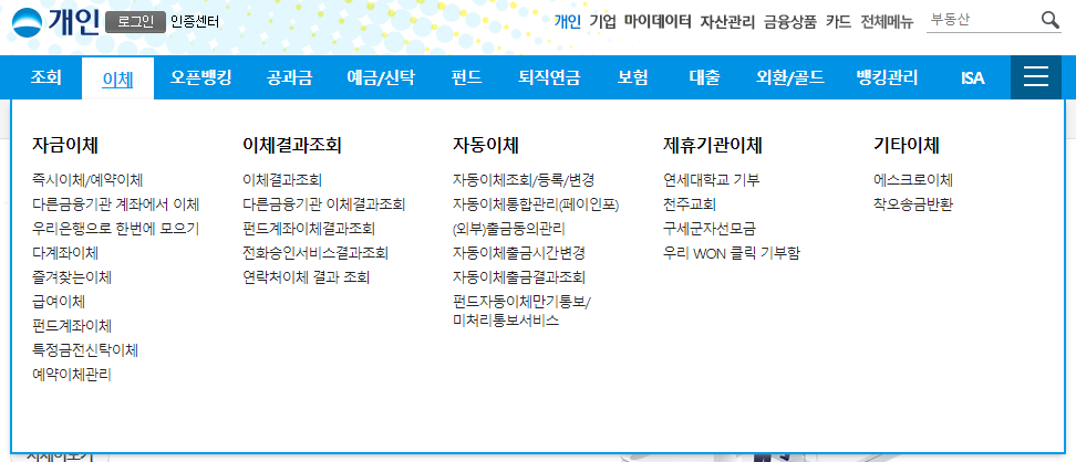 우리은행 인터넷뱅킹 홈페이지에서 확인할 수 있는 항목들은 다음과